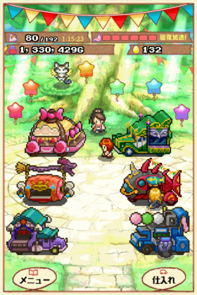 キャラクターはみんな個性的でイキイキしており、上のキッチンカーが集う画面を見てもわかるとおり、魔法で浮遊するキッチンカーや、戦車を改造したもの、魚型の水陸両用のキッチンカーもあります。