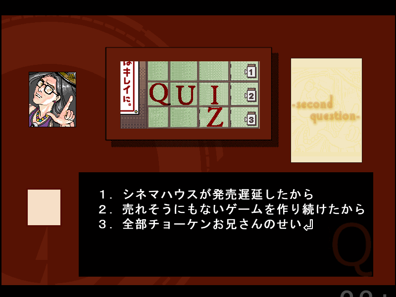 せめてシナリオの途中ではセーブさせてほしかったですね、クイズに失敗すると、基本的にはタイトルに戻されるし、セーブできないのでは、時間のある時に一気にクリアするしかないですから(まぁセーブできない、というのも演出の一部ではあるのですが)