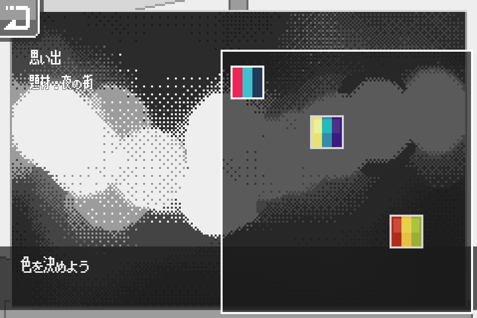 このゲームの評価は、ドット絵部分が特に評価されがちなのですが、私は色の配置をとにかく推します。選べるこの3色は、デザインのヒントサイトから得たカラーらしいのですが、それを自身の絵に落とし込んだのは、作者さんのセンスですから。