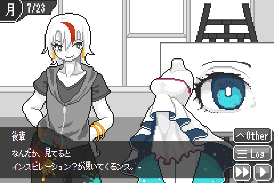 絵は、金曜日に先生に評価されて、その評価のセリフが、今のステータスのままで見られるゲームのエンディングのヒントにもなっています。