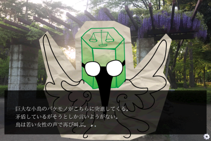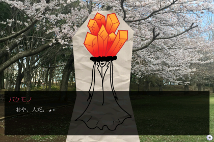 困ったまま、とりあえず近くを散策し、公園を歩いていると、奇妙な鉱石を頭に乗せたかのようなバケモノに出会います。