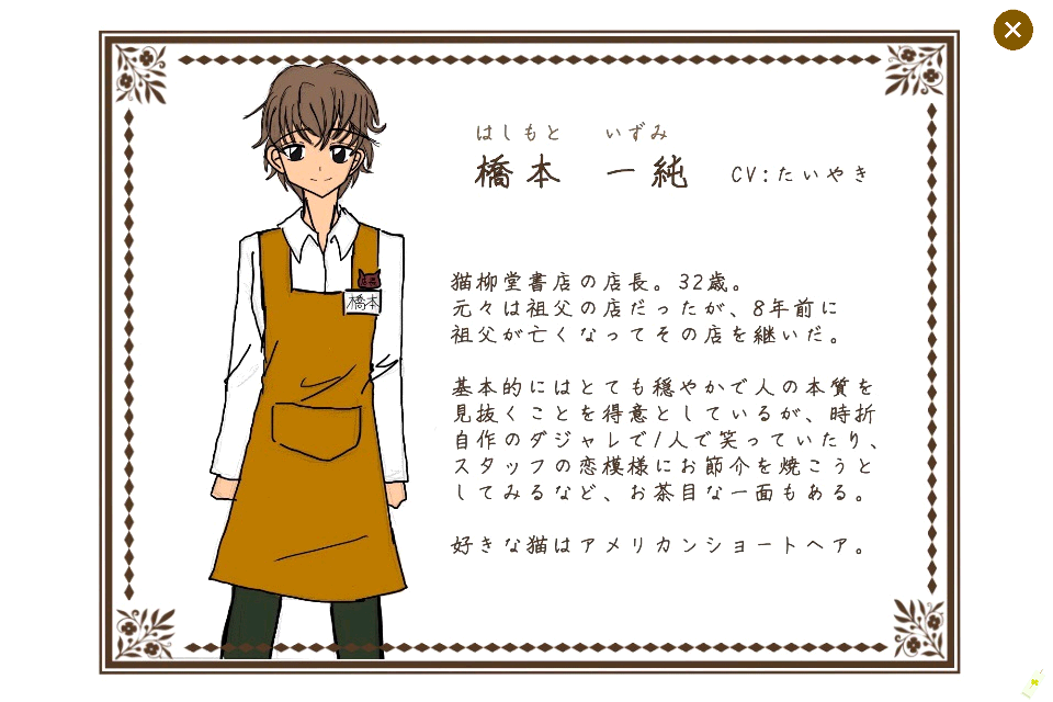 ゲームのおまけにはキャラクター紹介があります。こちらが店長さんの一純さん。