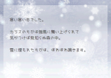 それは、愛しい夫を失った代わりに、ちびを利用しただけかもしれません…それでも、ちびは白ガラスの風体におびえながらも、少しずつ心を開くのです。