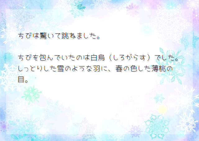 目が覚めた時に、ちびを羽根で包んで温めていたのは、アルビノの白ガラス。