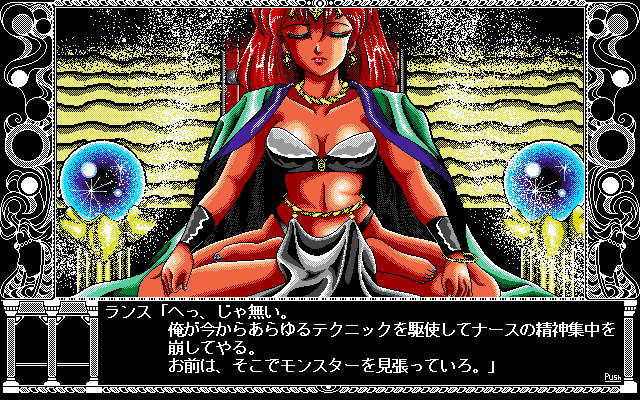 ついに瞑想をしているナースを発見!! ここでランス君の手腕(もちろん、ナニだ)により、ナースの精神集中を解くことに成功、ヘルマン軍に混じり共に戦っていたリーザス兵士の洗脳は解かれ、ヘルマン軍はリーザス兵に逆に攻撃される事態に。
