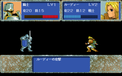 戦闘はこんな感じ。ルーディーことルートヴィクスが死ぬとゲームオーバーかな? 気を付けないとなりませんね。主人公ならレベルを上げたいから前線に出しがちだけど。