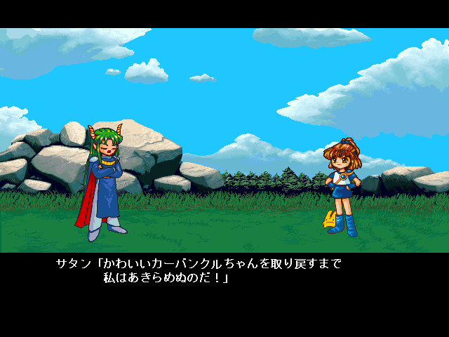 カーバンクルを返して欲しいサタンは、アルルに「ちんちくりん」と言い放ち、それに怒ったアルルは魔法を発動!
