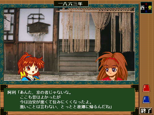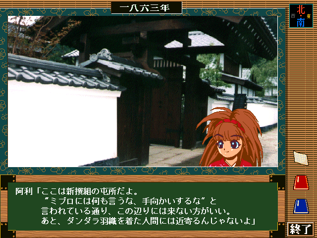新撰組はこの時代の京の都では最も恐れられており、駐屯所には近づかないようにと忠告する阿利。