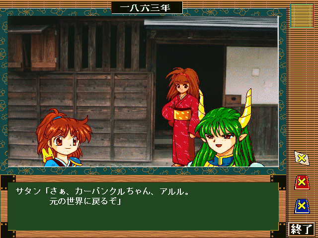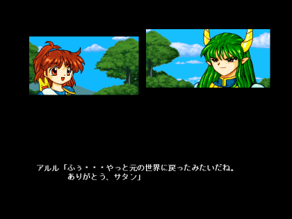 アルルは、阿利たちとの別れを惜しみつつ、サタンとともに元の世界に戻るのでした。