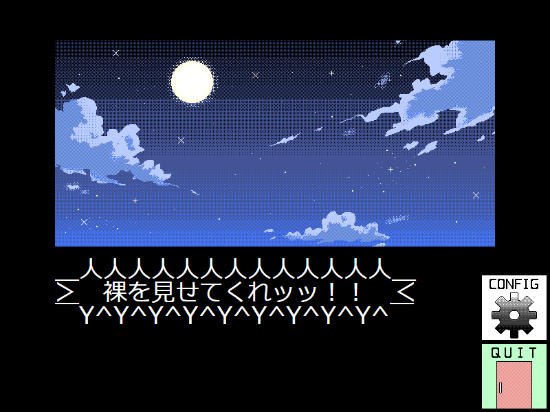 とにかくレトロテイストにこだわった一本ですが、残念ながらティラノの環境のせいで、256色以下にゲーム画面の色数を抑えるのが不可能なんですよねえ。