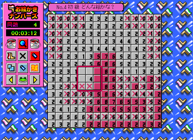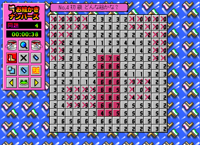 いわゆる普通の「お絵かきロジック」とは違い、マスに直接数字が書かれており、その数字の指示に従ってマスを塗りつぶし、絵を完成させていく…というパズルゲームになっています。