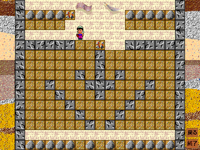 ↓キーで地面に爆弾を置き、左右キーで爆弾から離れ、↑キーで爆破、が基本動作になります。
