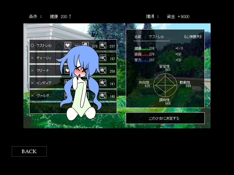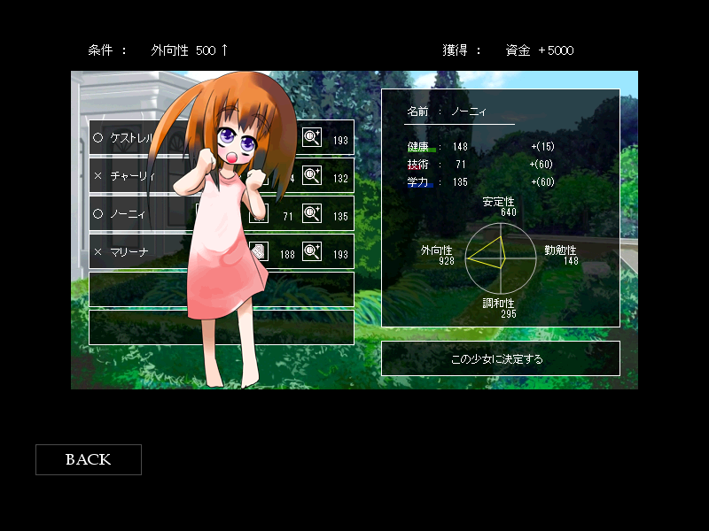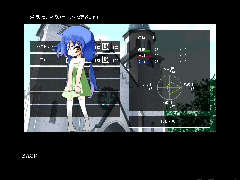 話を戻しますが、少女たちには上記のスクリーンショットの通り、健康と学習状況のグラフと、4つの方向に伸びたグラフになった性格を持っています。
