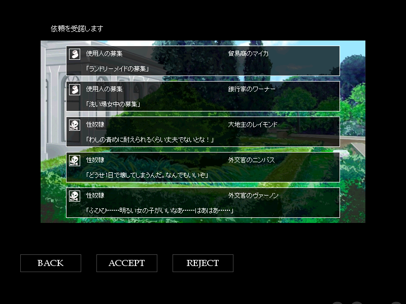 少女たちの見た目は、運営していくうえでは重要ではありませんが、ランダムで決められたその少女たちの12種類の見た目に応じて、肉奴隷として売り飛ばしたときのHイベントが異なってきます。