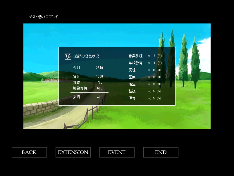 現状、しばらく達成は無理だな、って依頼も早めに弾いて、達成しやすい依頼に置き換えるのも大事。1か月に数件達成したときの名声上がるイベントの功績も意外と馬鹿にならないので。もしグッドエンドを目指さず、2年継続エンドを目指す場合は、教育用品は捨て、保健施設やセキュリティに投資し、時々健康な少女を高額な闇社会依頼に送り出して、資金を欠かないようにする(やりすぎ→逮捕には注意)