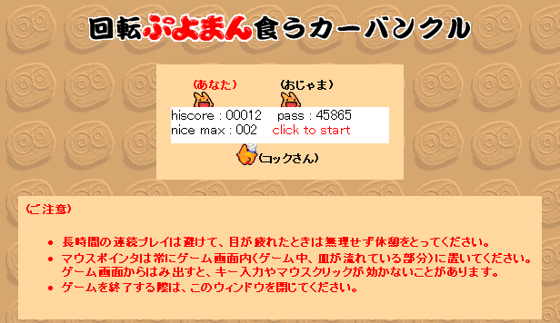 右から、ぷよまん・こげぷよまんが流れてくるので、ぷよまんが来たタイミングで、クリックで食べましょう。