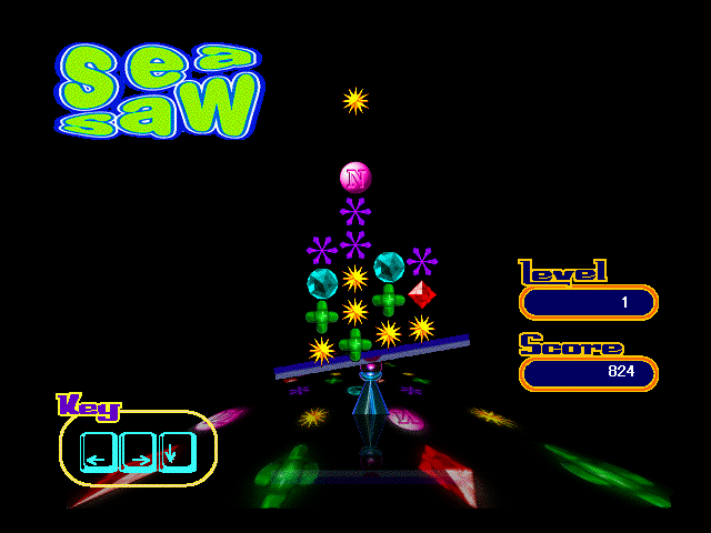 横6マスのシーソー台の上で、縦横斜めに3つ、同じピースを並べて消していくというシンプルなルールの落ちものパズルゲーム。