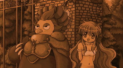 また、ルルーエンドにも関わる、ミノタウロスの頭に看板が落ちるイベントも見ておきます。これでアウルベアとルルーの対決のフラグが立ちました。