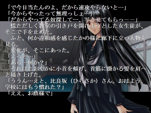立ち絵は基本的に変化せず、表情の変化などはありません。制服とジャージの差などはありますが、大体は、初音に操られている際に目の色が違う程度の変化しかありません。