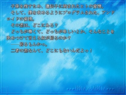 アンドロイドとはいえメカ線とかないし、メカ子モノとしてはちょっと物足りなかった感じはありましたが、初プレイ時から好きなシナリオのゲームです。