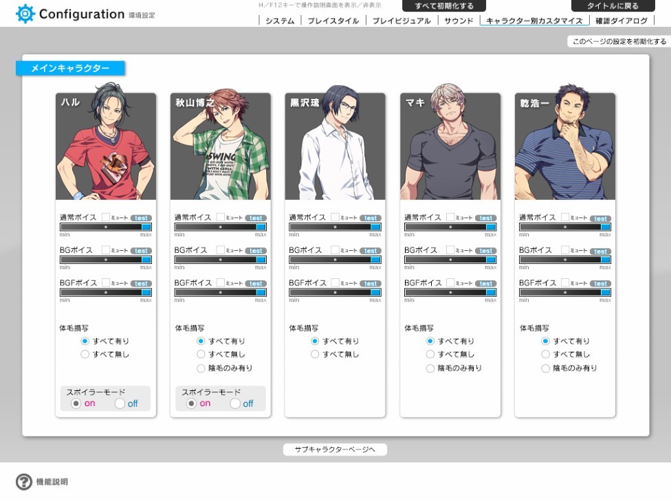毛のオンオフ、BGV(バックグラウンドボイス、Hシーンの背景に流れる喘ぎ声やフェラ音など)のオンオフ、キャラごとの声のオンオフ(モブにはあまり喋って欲しくない人には重要ですね)など…