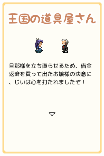 多額の借金を抱えてしまった父親を助けるために、お付きの「じい」と共にお店を経営し、借金を返済、そして借金のカタに奪われてしまった伝説のアイテムを取り戻していく…という経営SLG。