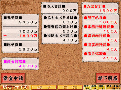収支フェイズで5000万の借金をします。うわー借金生活悲しい。しかし何をするにもお金のかかるゲームです、仕方ないのだ。