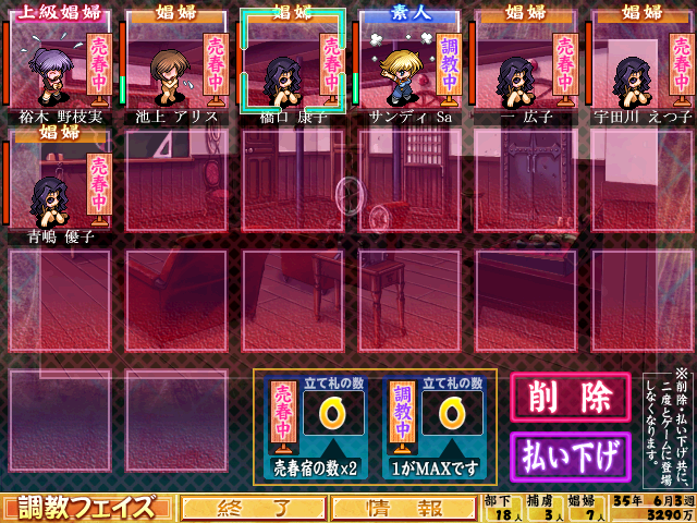 冒頭イベで仲間にした女子学生を売春宿送りにします。雇ってみたものの、ステータス見たら政治能力低いからいらんのです。さらば。