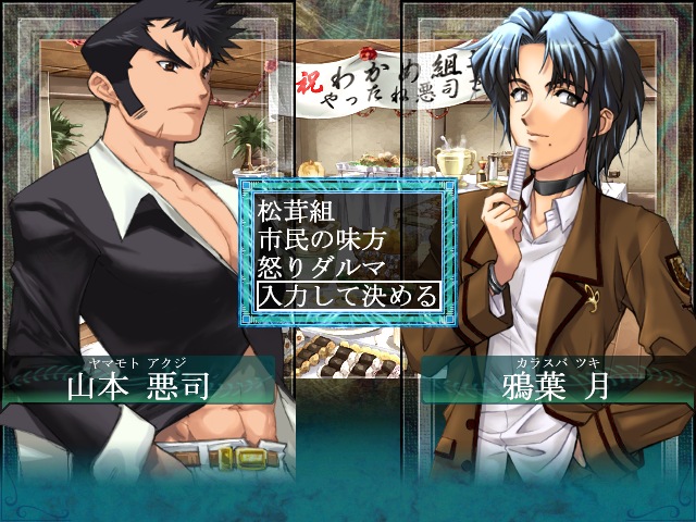 祝賀会です。ここでわかめ組は壊滅という扱いになり、新しい組織を名乗るのだけど… …だ、ださい…どの名前もださい… …椎茸組になりました。名目上は殺がリーダーです。