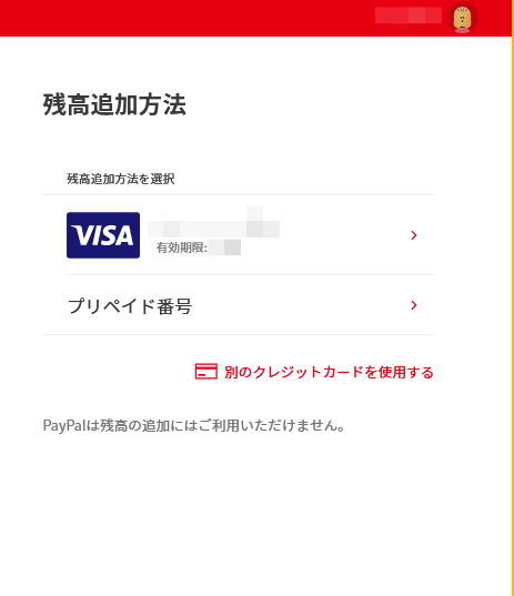最後に「残高追加方法」から、クレジットカードかプリペイドカードかを選び、あとは手順通りに、という感じです。