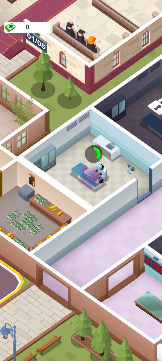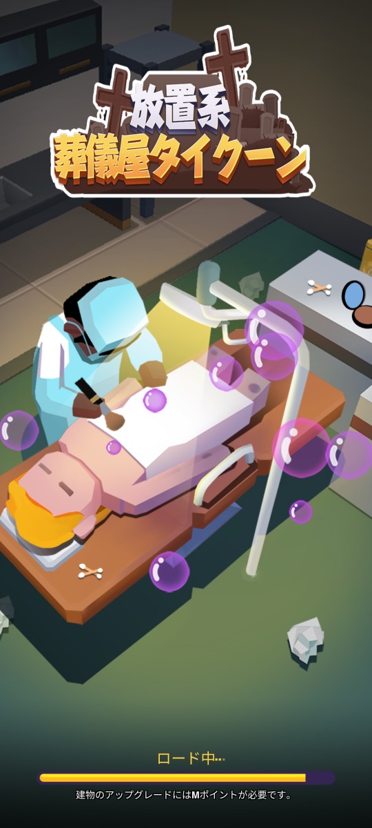 駐車場、遺体処置室、墓地、などの各設備を、お金を消費してレベルアップしていくと、収入がアップしたり、お客さんを処理できるスピードが上がっていきます。お客さんや、施設のスタッフをタップすると行動速度が上がったりはしますが、基本は放置するタイプのゲーム。