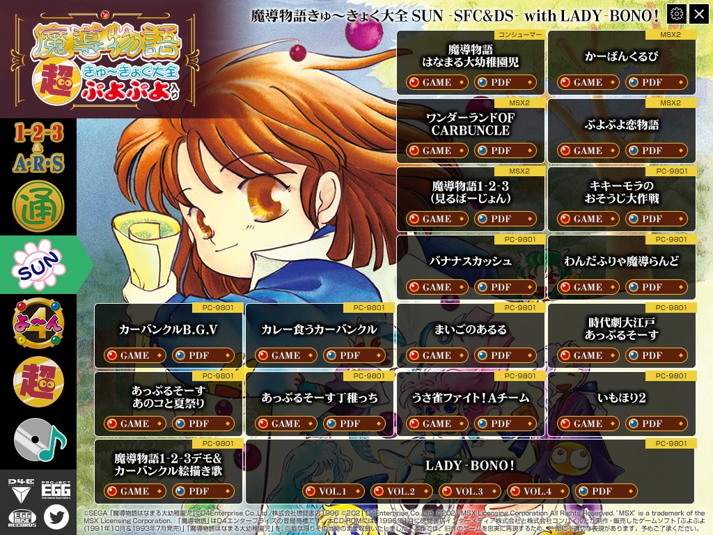 LADY-BONO!やいもほりシリーズなど、一見ぷよぷよ及び魔導物語に関係のないようなタイトルが含まれていますが、これは、ゲーム内にぷよぷよキャラが登場するためにProjectEggで配信できないというタイトルになります。