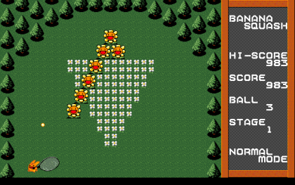 カーバンクルが主役のアクションシューティング。自機(カー君)の列は画面下部固定で、左右に移動しながらハチやキノコなどの敵を倒しつつ、木から落ちてくるリンゴをキャッチしなければならない… …というなかなかに忙しいゲームです。画面全体の動きをよく見ないといけなくて、すっごい難しい。