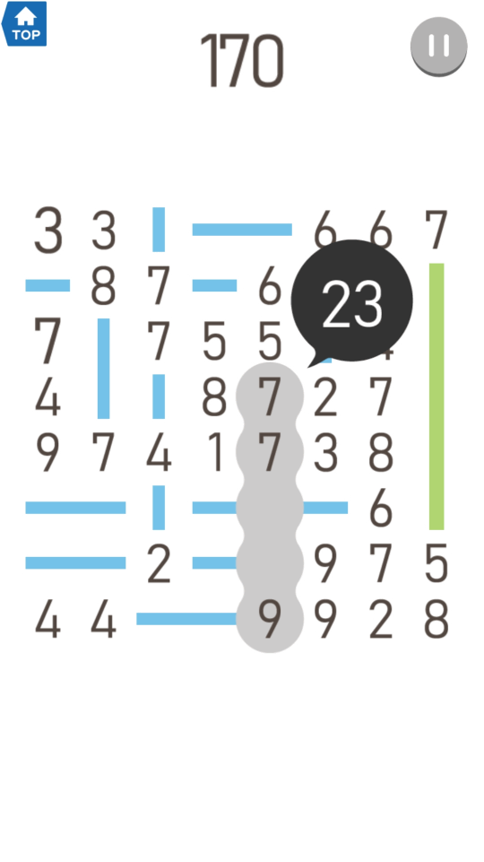 画面上にある数字、例えば2と8、4と5と1など、あわせて10になる数字をなぞるパズル。あわせて10だけじゃなくて20にすると高得点。