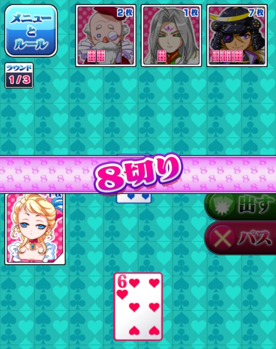 よくある大富豪ではあるが、キャラクターが可愛くディフォルメされた偉人キャラから選べるのじゃ。わらわはアントワネットさんなのじゃ。かわいいのじゃ。