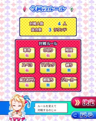 ルールがいろいろあるのじゃが、9つのハウスルールをオン/オフ切り替えて、好きなようにカスタマイズできるのじゃ。定番の8切や革命だけではなく、Jを出すと一時的に強さが逆転する11バックなどの珍しいルールも設定できるので、好みのルールにするといいぞよ。