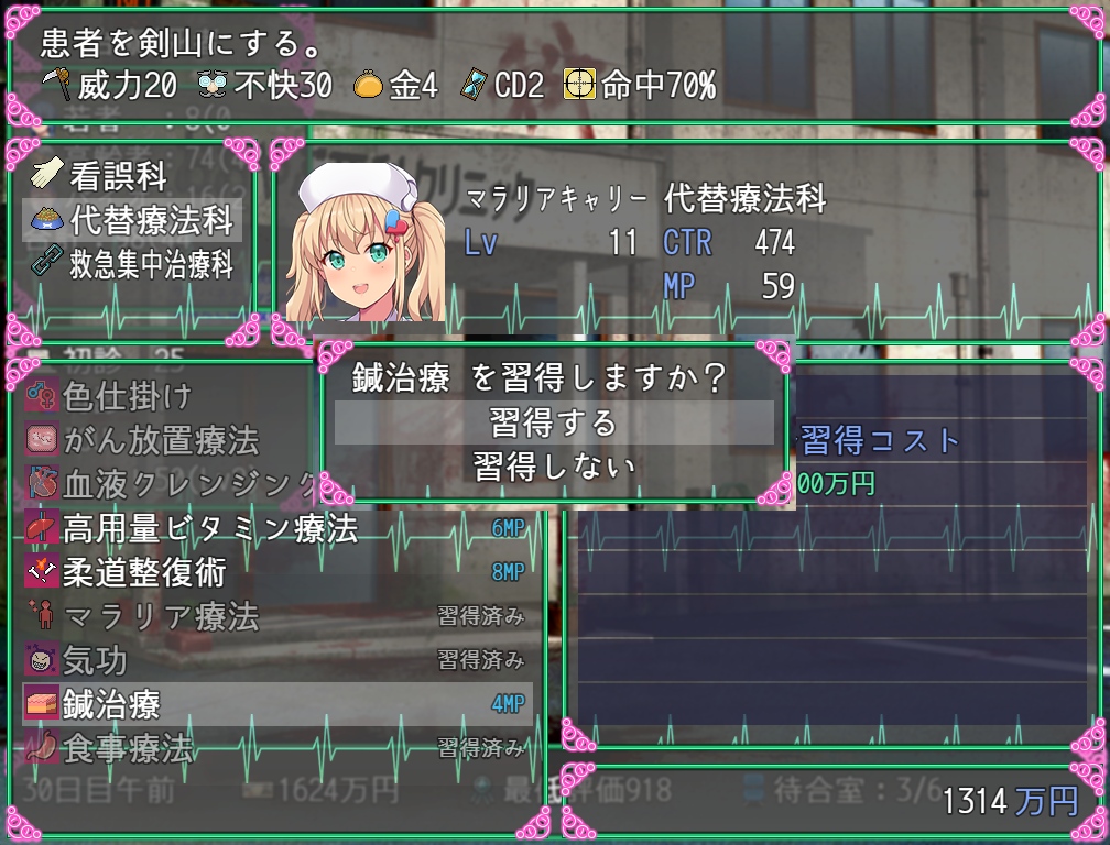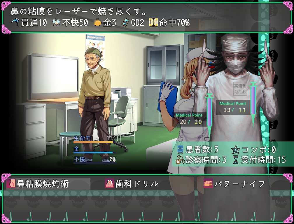 得たお金によりスキルを覚えたり、病院の設備などのランクを上げていくことにより、より多額の治療費を奪い取るという仕組み。