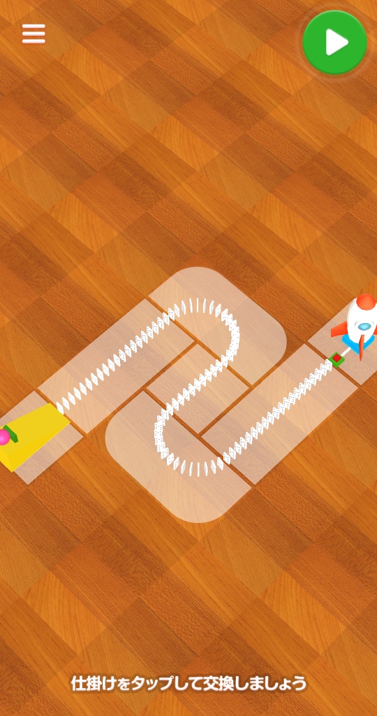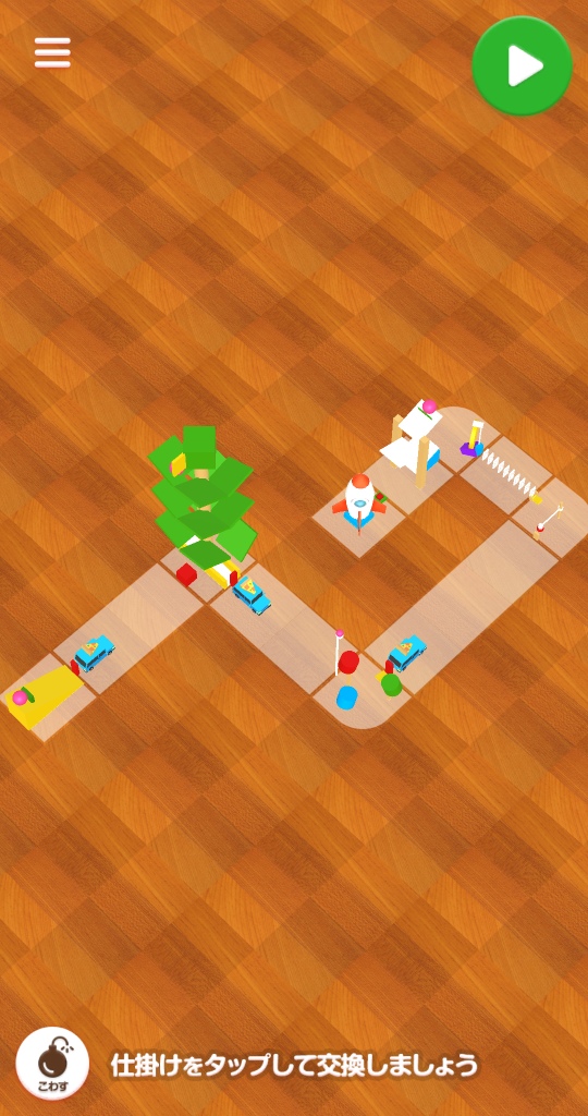 このままスタートしても観賞用のアプリとして楽しめますが、しかけを入れ替えるだけで、オリジナルのコースとして全然別のものを作れるのが楽しいです。
