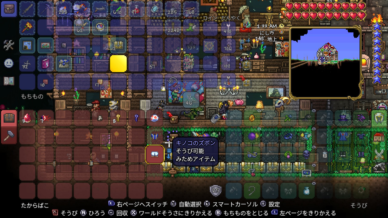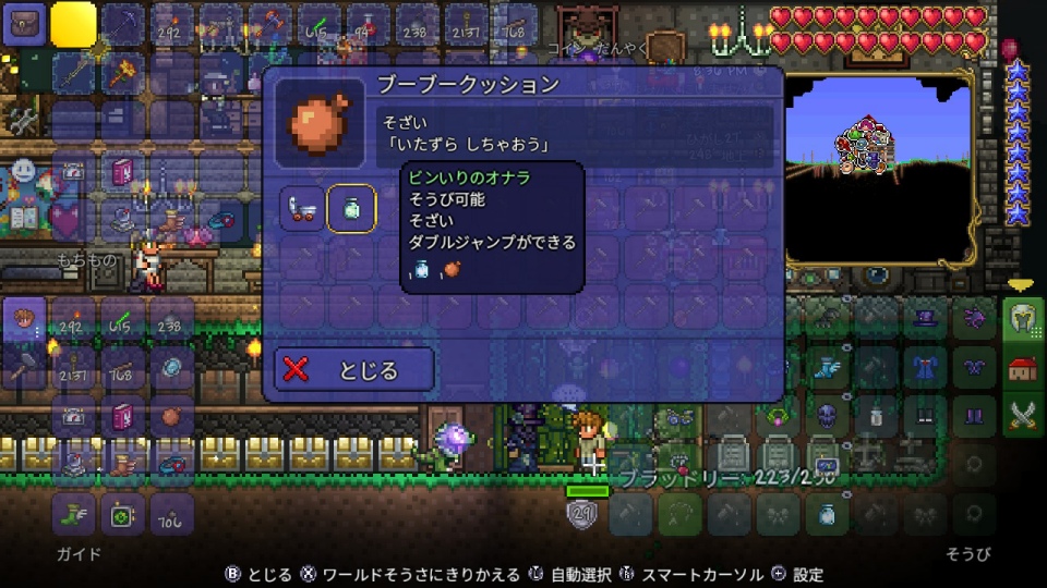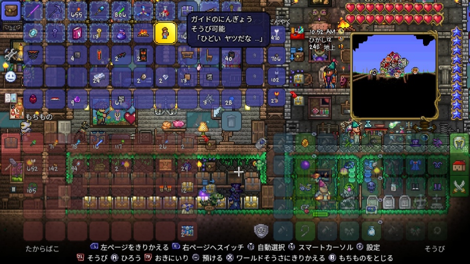 なお地下でガイドが寂しそうに過ごしていますが、さすがに一人で地下は寂しいかなと思って、サボテンの装備品をつけた人形を一緒に部屋においてあげています。