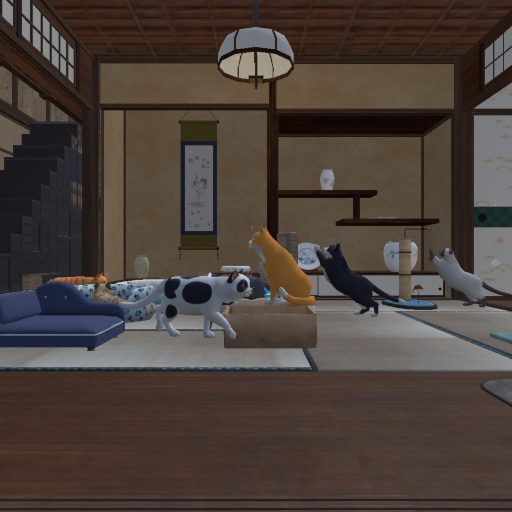 ちょっと作りこみが甘く、爪とぎを使うと空中でバリバリしていたり、眠っている子はベッドにめり込んでいたりしますね…