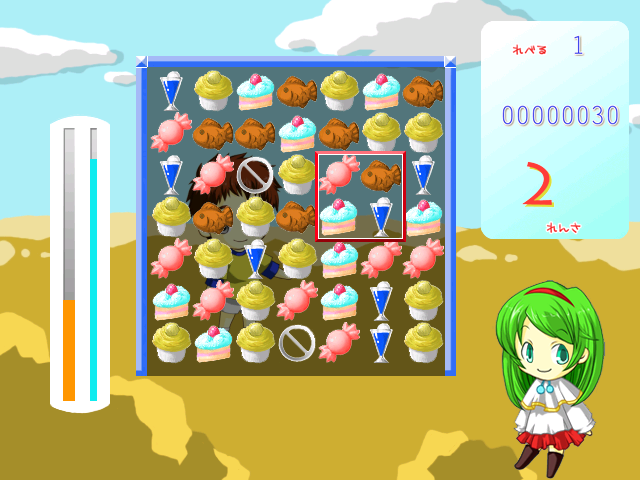 マウスでカーソルを合わせたところに四角形が現れるので、クリックで回転、または右クリックで反回転させ、お菓子を揃えていくアクションパズルです。